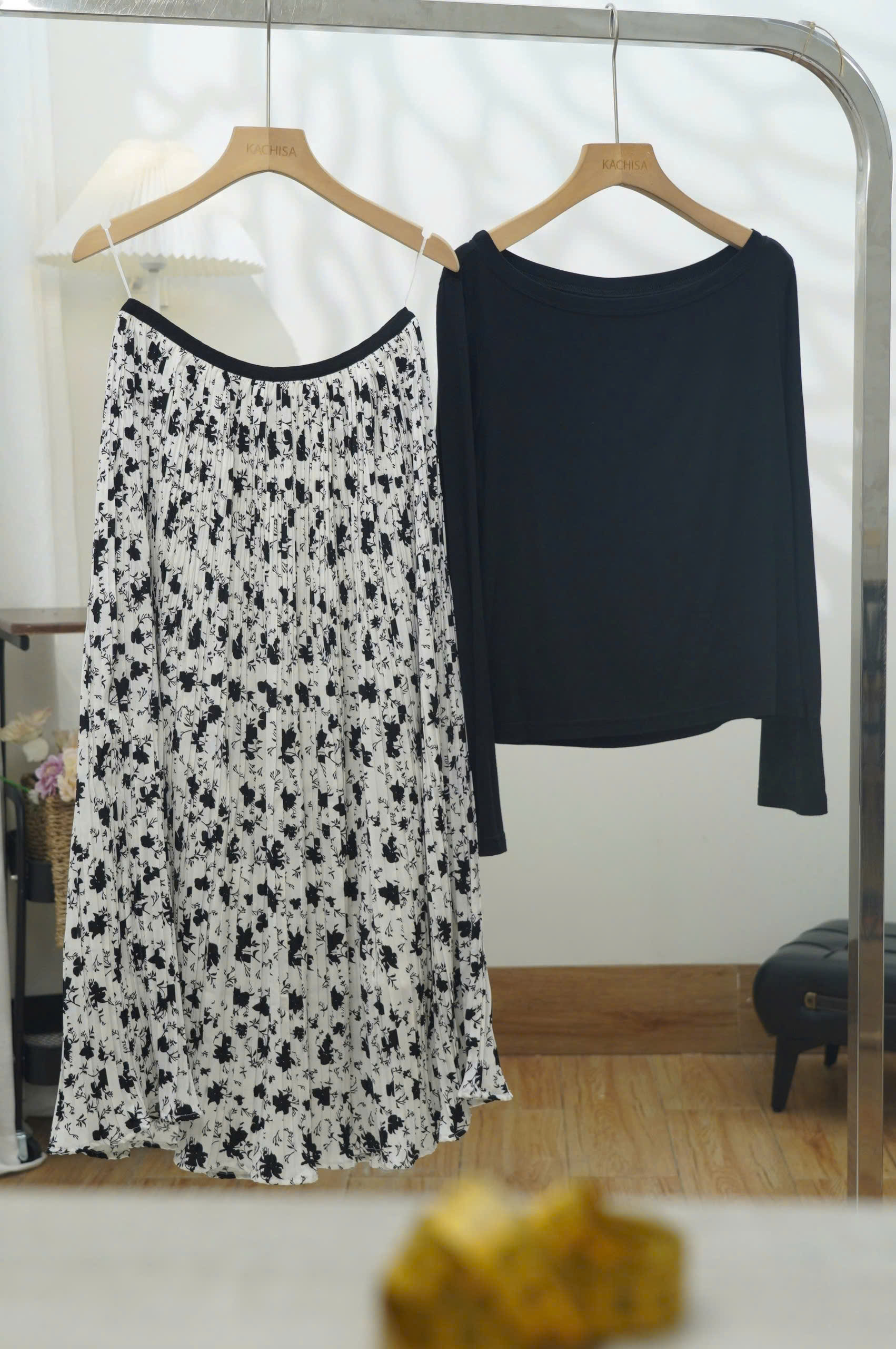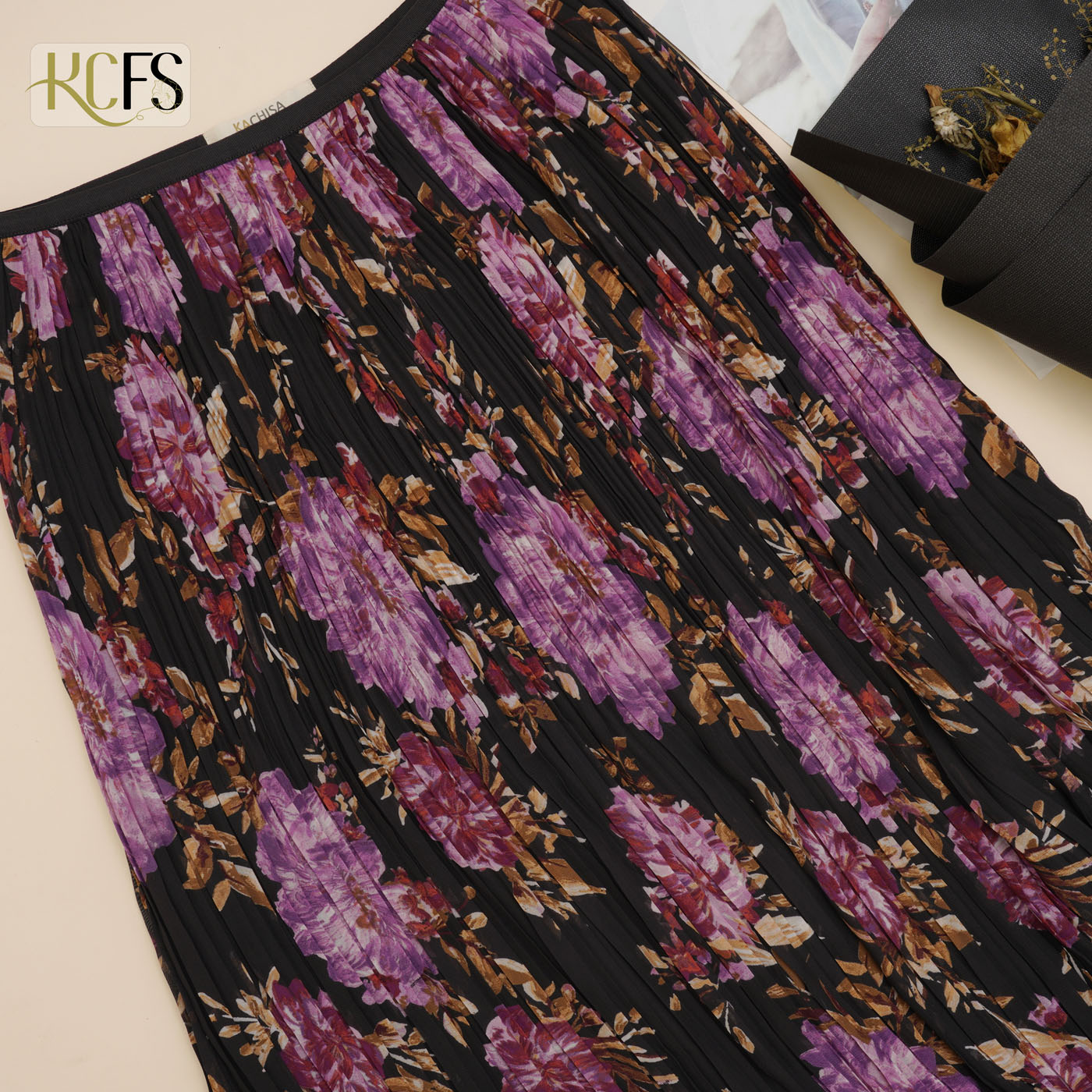 Chân váy Tơ voan in hoa Dập ly 2 sóng, có lót lụa Habutai mềm mại, sang trọng