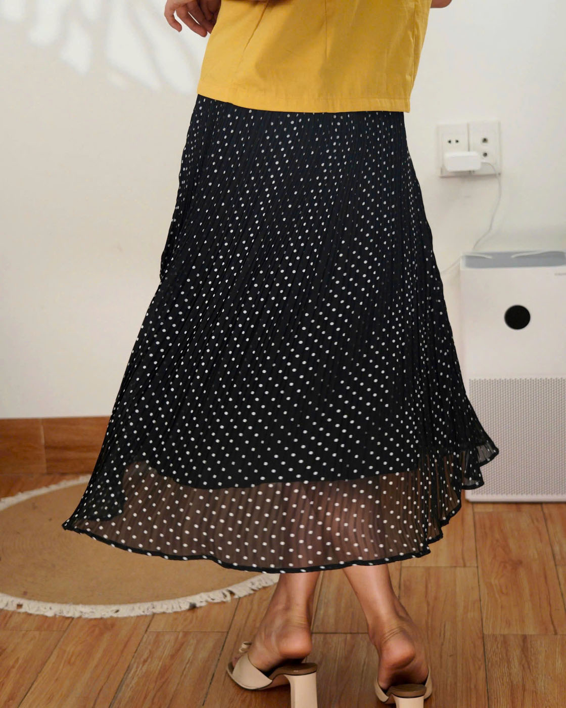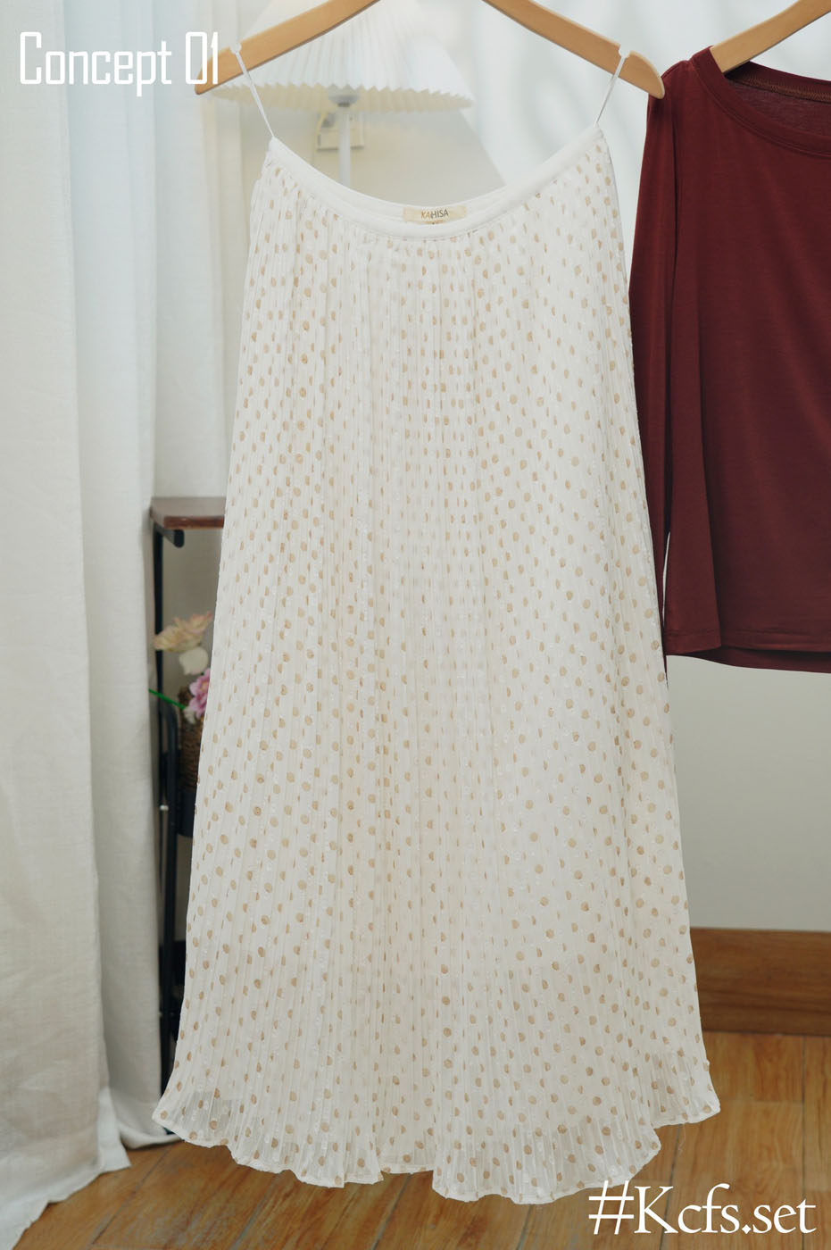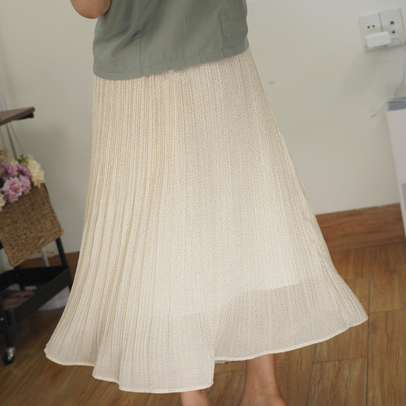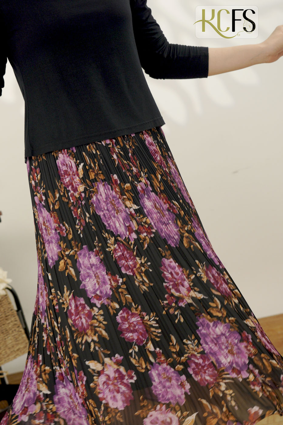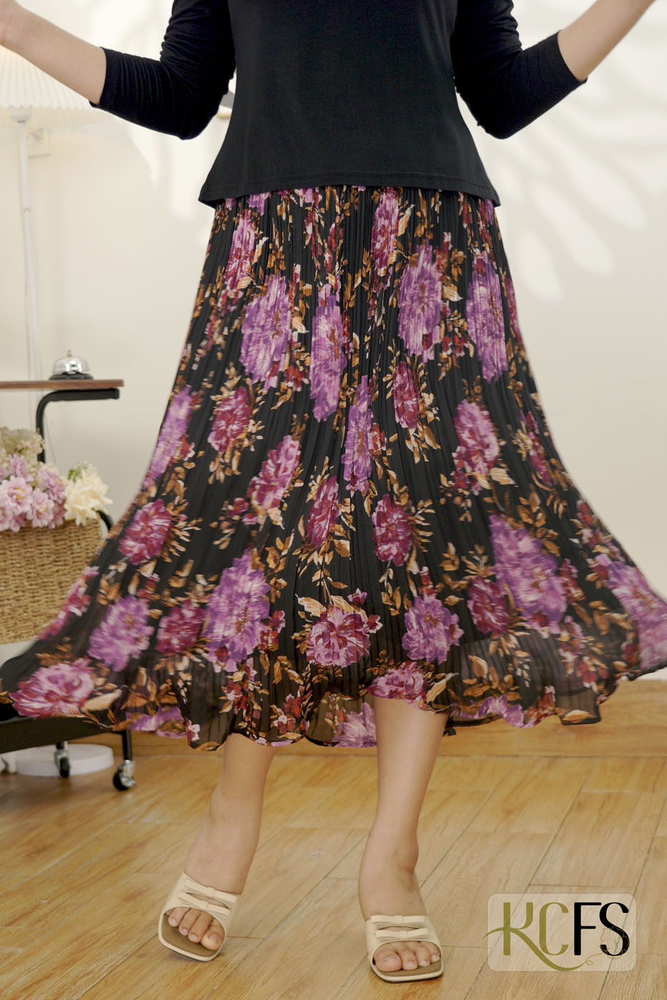 KCFS – Chân váy Tơ in hoa Dập ly 2 sóng, có lót lụa Habutai mềm mại, sang trọng