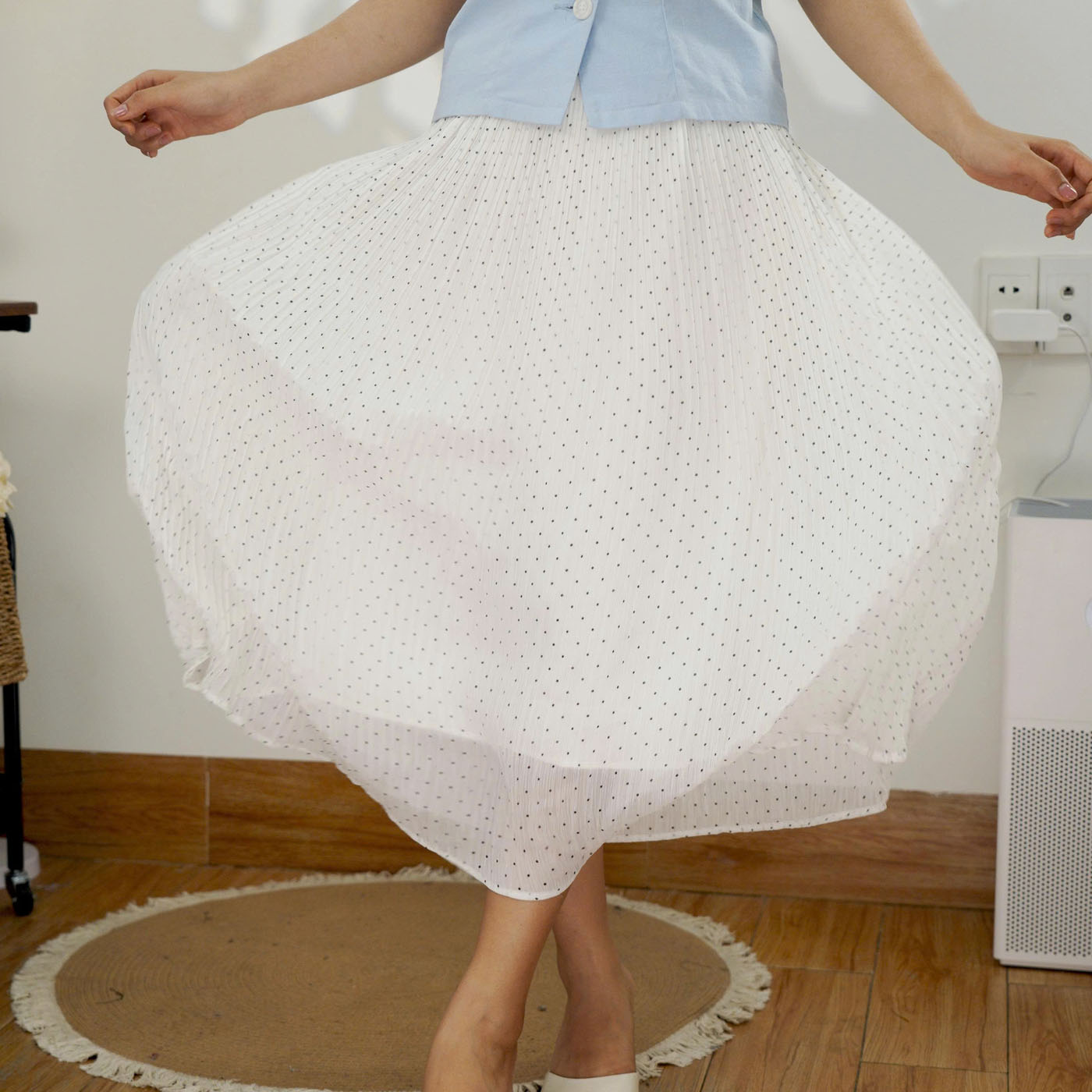 Thiết kế: Chân váy hoa dập ly 2 sóng độc lập, giúp tăng độ bung xòe tự nhiên. Kiểu dáng này không chỉ giúc chân vớng bích hơn mà còn gây ấn tượng với hiệu ứng thươt tha đầy cuốn hút. Lưng thun kẹp cao cấp, co giãn tốt, giúp dễ mặc, phù hợp với nhiều dáng người.